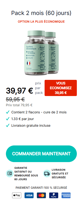 Si vous n’êtes pas complètement satisfait des résultats de Glucavit dans les 60 jours suivant votre achat, nous vous remboursons intégralement, sans poser de questions. C’est notre engagement envers votre satisfaction.